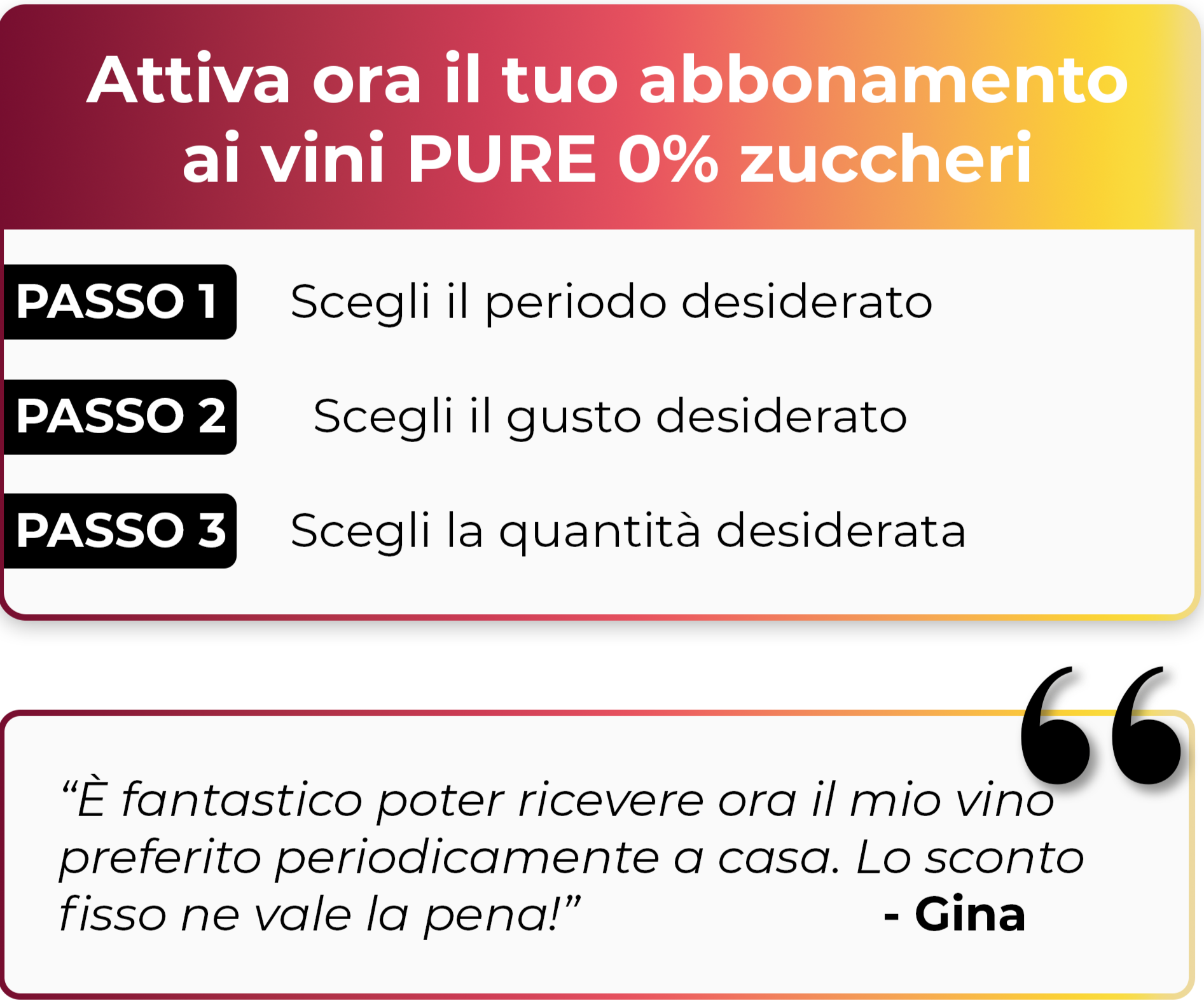 ✔️ Ricevi automaticamente il tuo vino preferito PURE Zero Sugar con la frequenza che desideri.